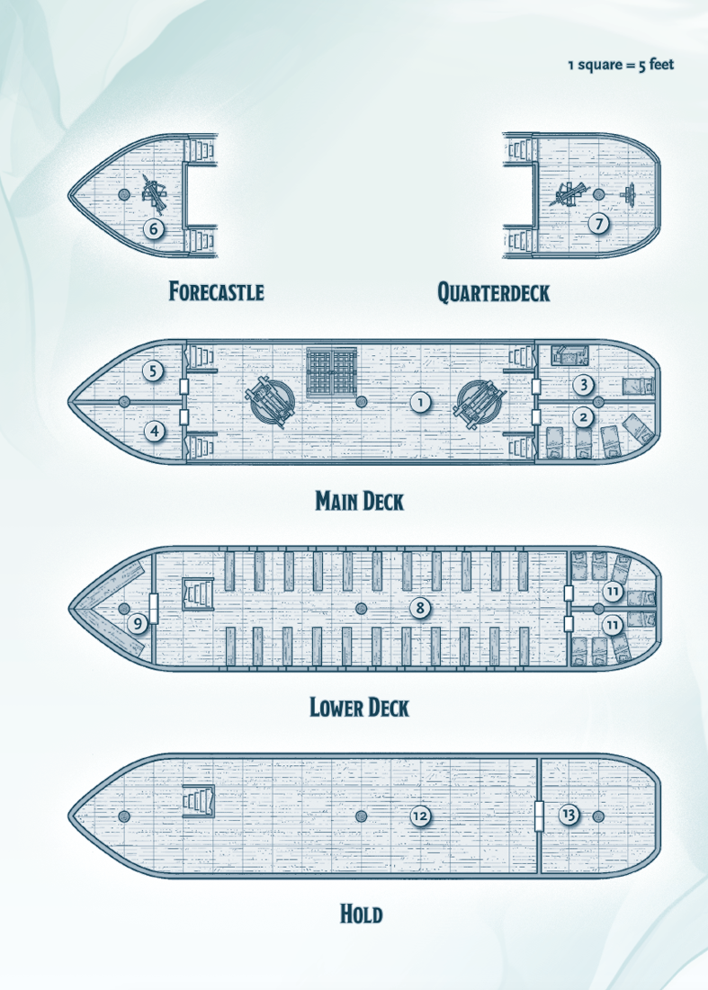 The main deck has a -high rail around its perimeter that provides half cover for Medium creatures and three-quarters cover for Small creatures behind it.